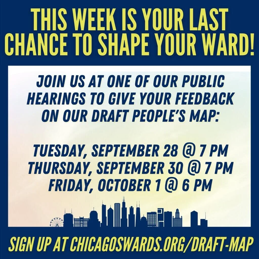 To the people of Chicago, we are inviting you to submit proposals, testimony, or general feedback on how you believe your community should be reflected in Chicago’s 50 wards based on YOUR interests and NEEDS!