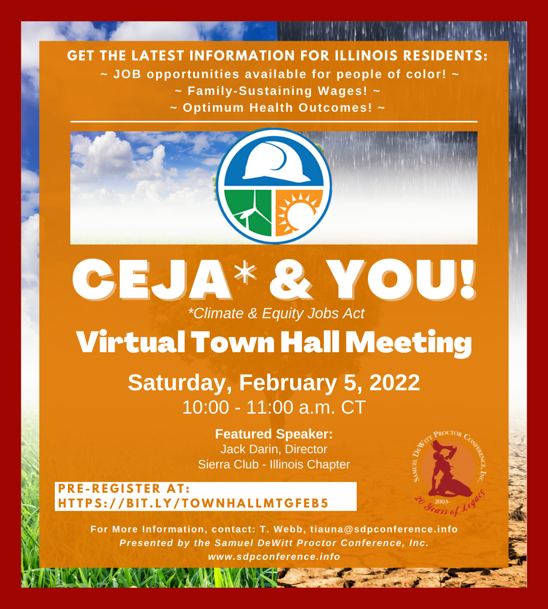 The passage of the Clean and Equitable Jobs Act (CEJA) in Illinois, has created job opportunities for people of color, most impacted by environmental racism and the adverse effects of climate change! Our goal is to get people in our congregations and communities connected to jobs as soon as they are available. RSVP to join us for a virtual townhall meeting on Saturday February 5th at 10:00 AM where we get the latest information to share with you and your church family so that we can get our folks connected to jobs, job training and money saving resources! Our featured speaker is Jack Darin from the Sierra Club, Illinois Chapter.