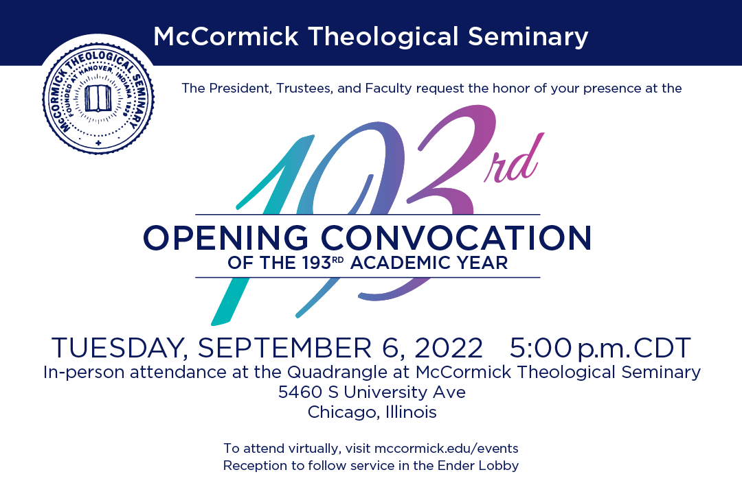 Join us for McCormick’s Convocation service celebrating the 193rd academic year! The celebration will take place at McCormick Theological Seminary on Tuesday, September 6th at 5 p.m. CDT, and will be hosted on zoom and streamed live to our Facebook page as well. Reception will follow the service.